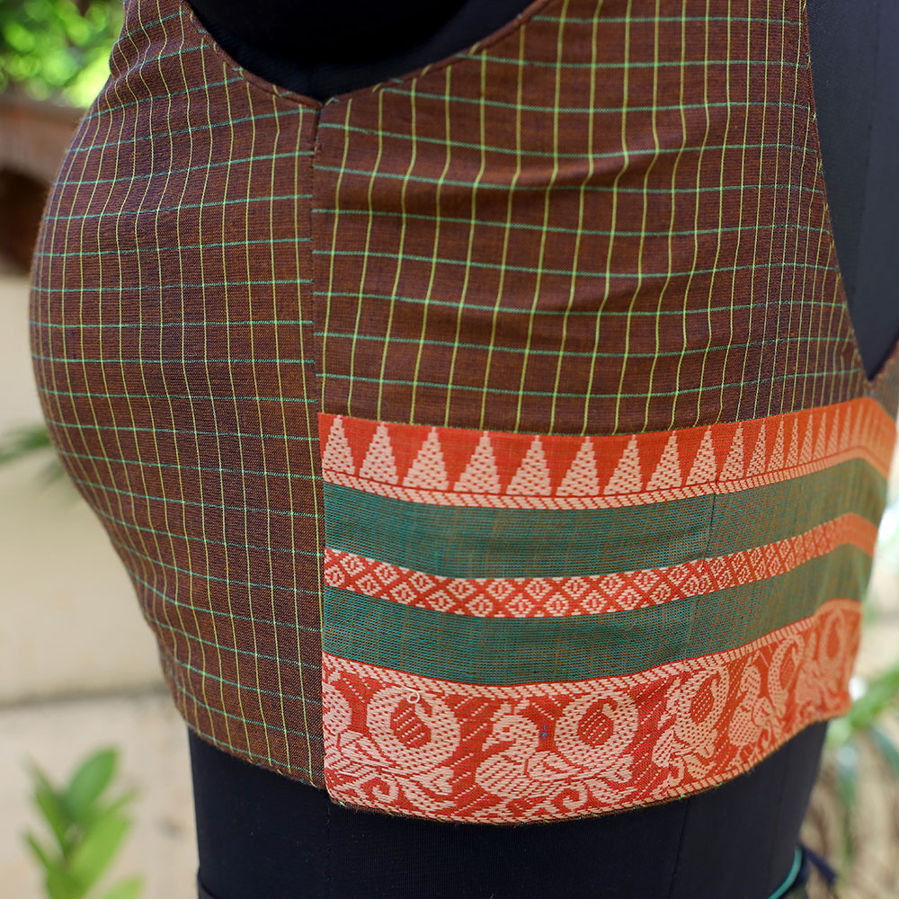A dark brown Venkatagiri checks blouse with front buttons and a simple v neck front and back.