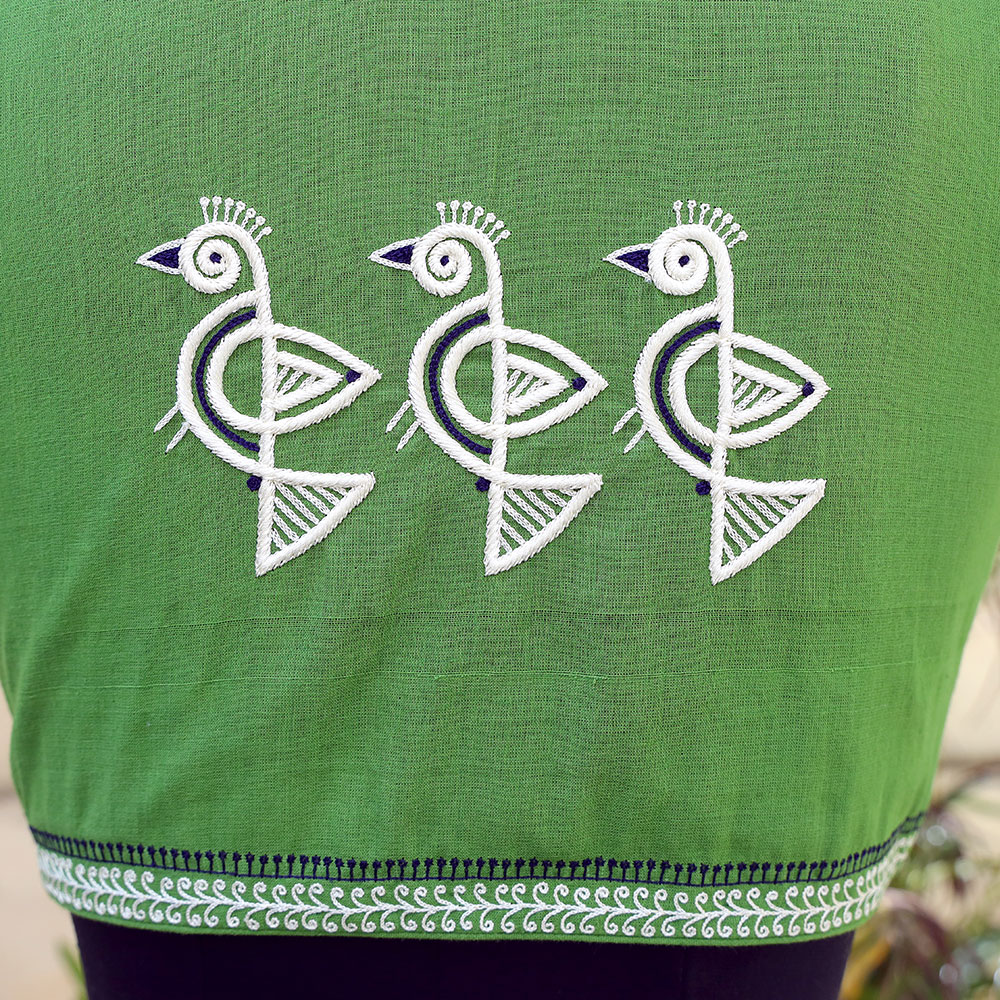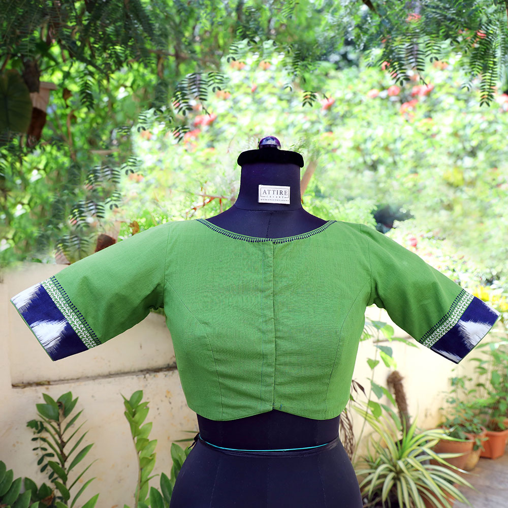 A green mangalgiri hand embroidered blouse with birds motifs on the back and Ikat patch on thje sleeves . It’s a very intricate hand embroidered blouse .